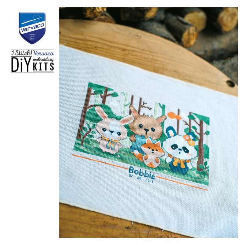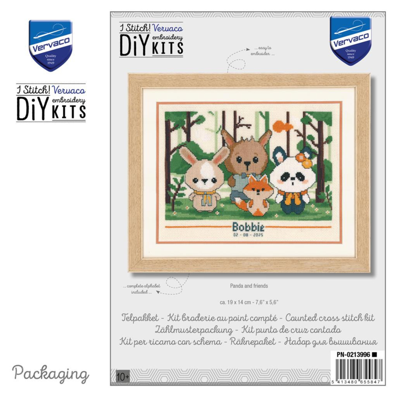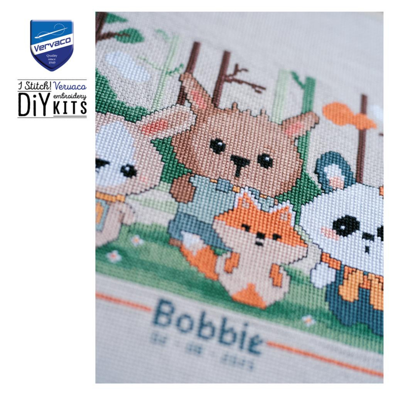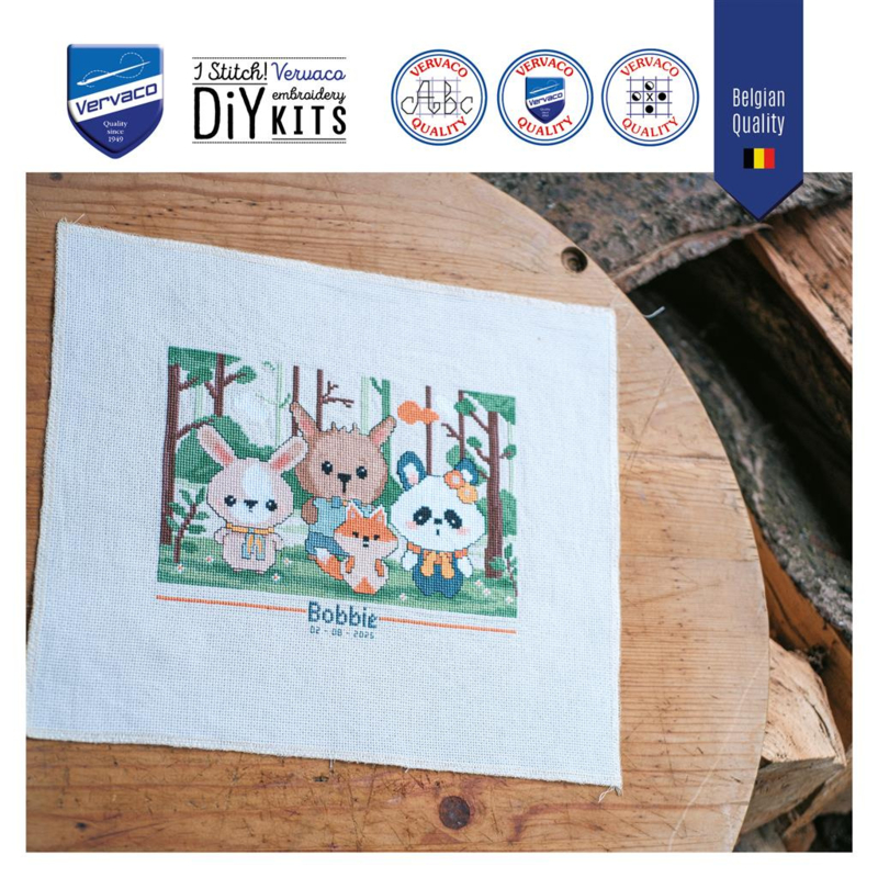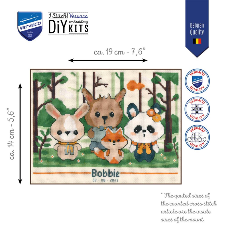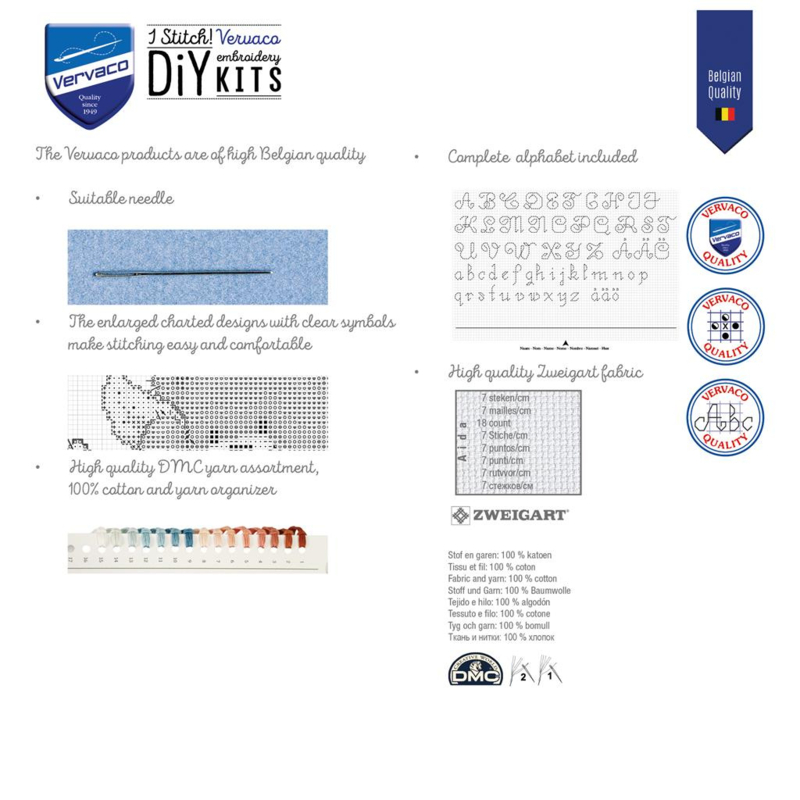 Inhoud: Borduurstof: 100% katoen, Garen: 100% katoen DMC, Aida 7 steken/cm, Garenkaartje, Werkwijze in 8 talen, Vergroot telpatroon, Naald, Foto, Met alfabet