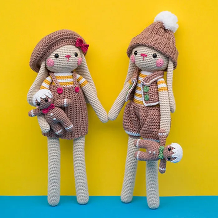Zo kun je Fie de Schotse hooglander met haar warme jas haken of peperkoekkonijntjes Julia en Jesse.