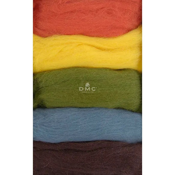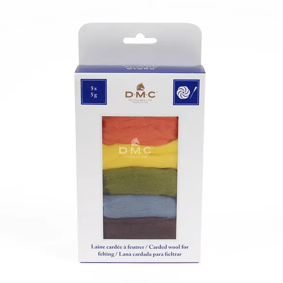 Elk pakket bevat 5 kleuren van 5 gram 100% gekaarde wol in bijpassende tinten – perfect om meteen mee aan de slag te gaan.