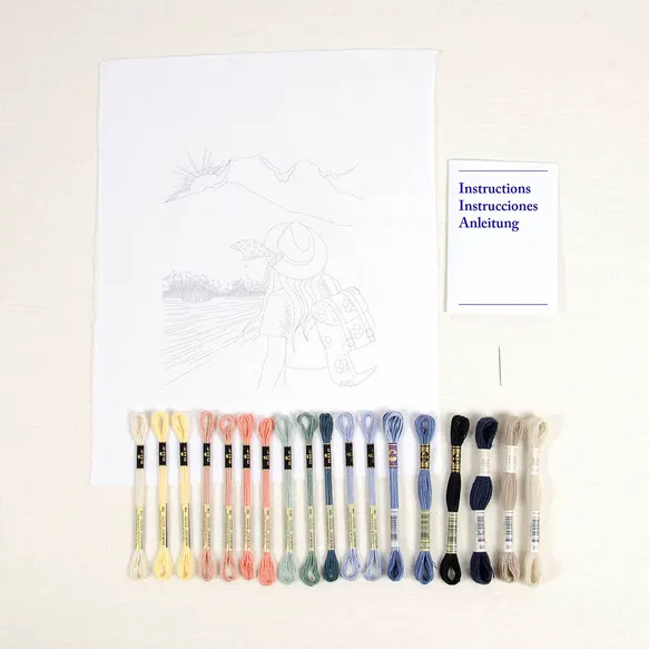 OverzichtMet de DMC Backpacker borduurkit van de getalenteerde ontwerpster Joanna Hateley maak je een borduurwerk met traditionele borduursteken.