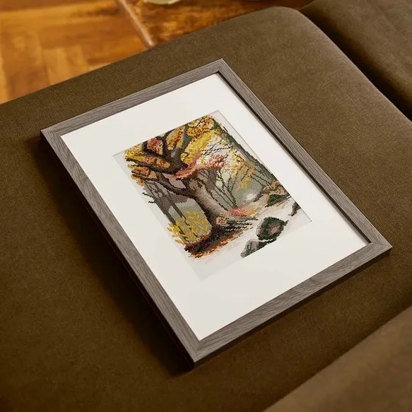 OverzichtMet de kruissteekkit Fall Scenery van de Franse ontwerper Marie-Dominique Procureur maak je een borduurwerk met kruissteek borduren.