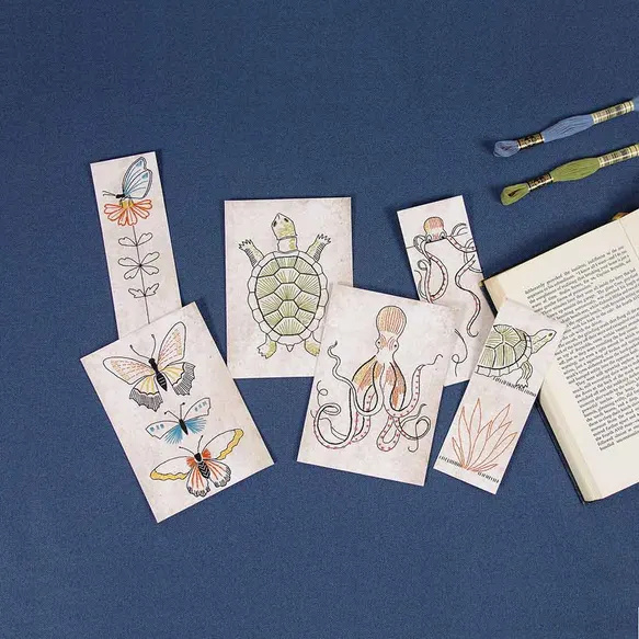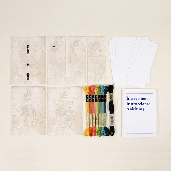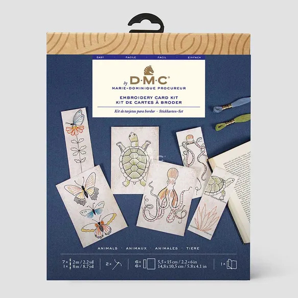 OverzichtMet deze DMC borduurkits voor kaarten van de Franse ontwerper Marie-Dominique Procureur maak je een borduurwerk met traditionele borduursteken.